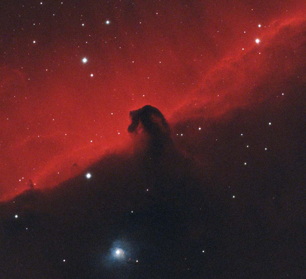 The Horsehead Nebula is an iconic dark nebula, famous for its horsehead-like silhouette set against a bright emission nebula. It's a highlight showcasing the interplay of light and darkness in space.